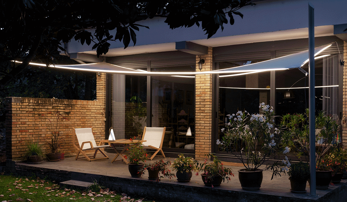 These sails serve as excellent support material for installing lighting, which is why we have developed a system that incorporates lighting within the contour of the sail, transforming it into both a shade by day and a lighting system by night.