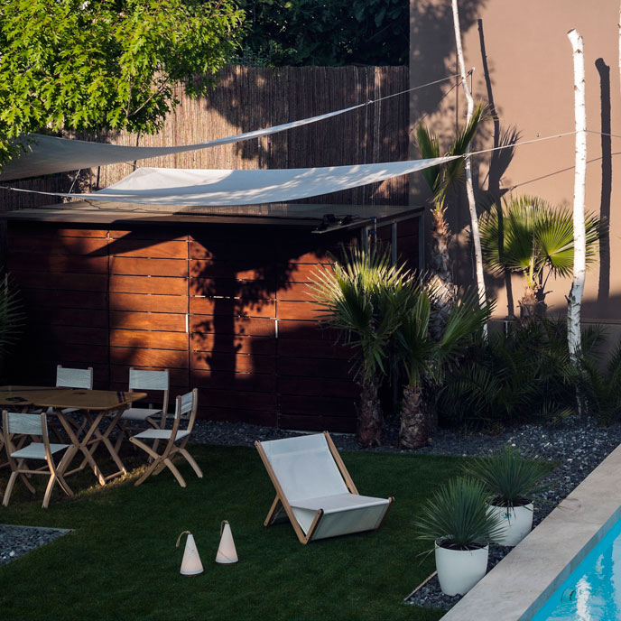 Las dos velas triangulares se sujetan con un sistema simple de tensión a puntos de anclaje con poleas para crear la sombra perfecta en la zona de comer del jardín de esta vivienda unifamiliar. El sistema permite levantar o bajar las velas para ajustarlas según necesidad. Igualmente para guardar la vela en temporadas en las que no se use.